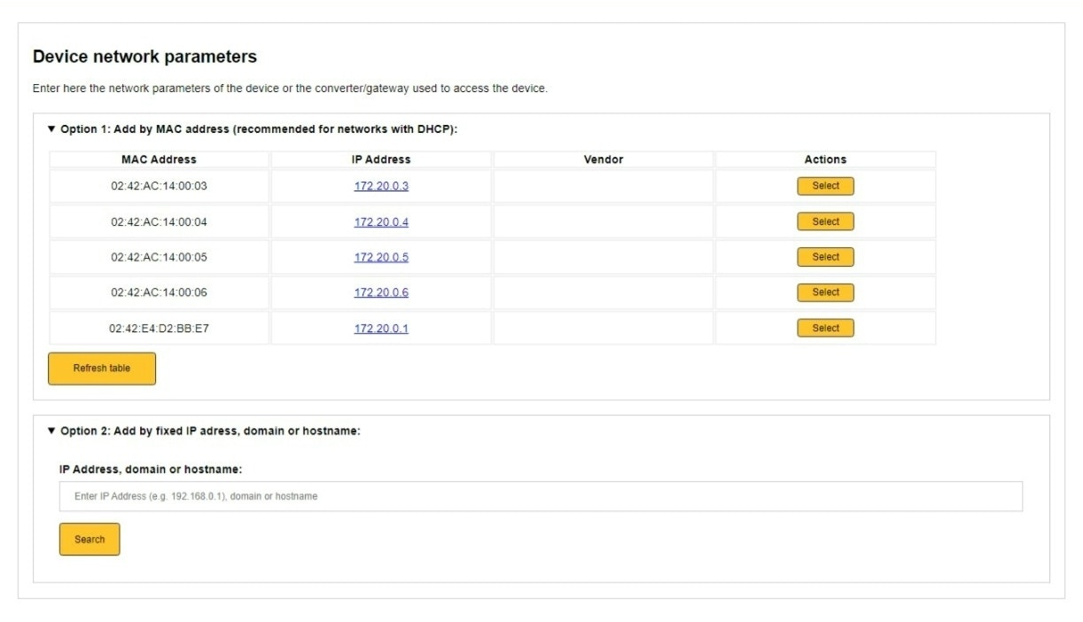 - (Only shown for Ethernet TCP connections, skip this step if you are using RS485 connection). Select the device you want to add. You can do this by: a. Add by MAC address (recommended). b. Add by IP address (not recommended unless you are sure the converter has a fixed IP address).