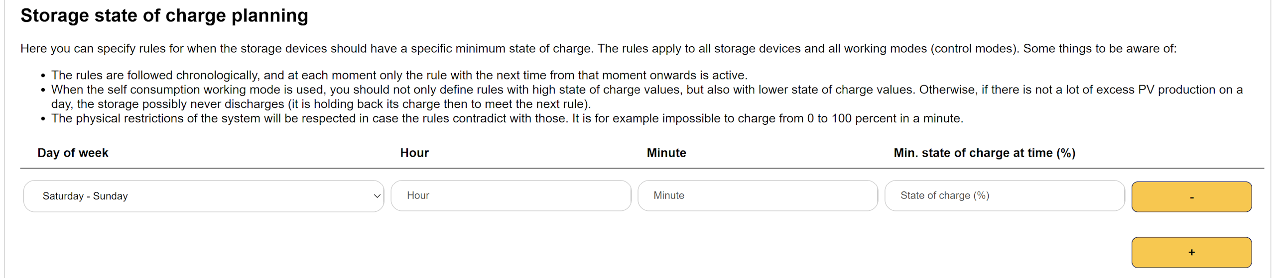 Log in to the SmartgridOne Controller and go to ‘Settings’→ ‘Advanced Settings’. Under the ‘Storage state of charge scheduling’ section, you can specify rules for times when the battery charge should have a certain minimum percentage.