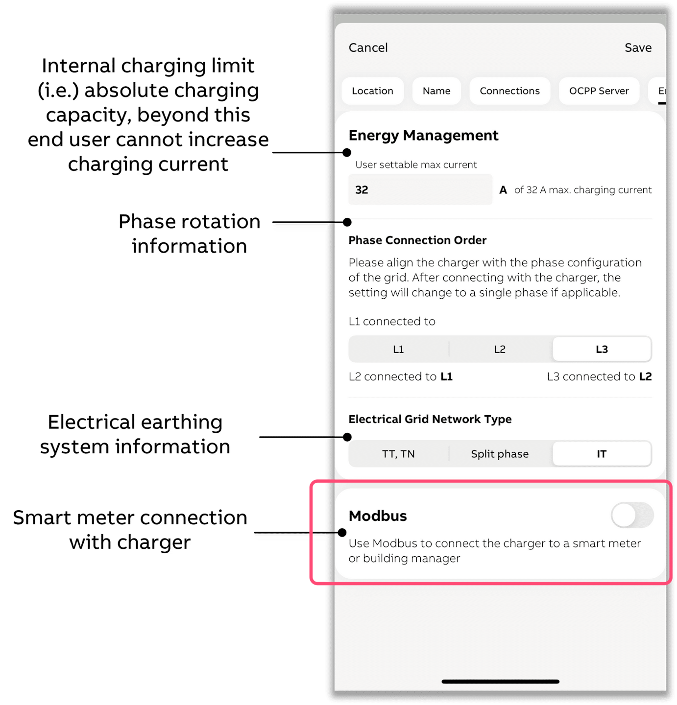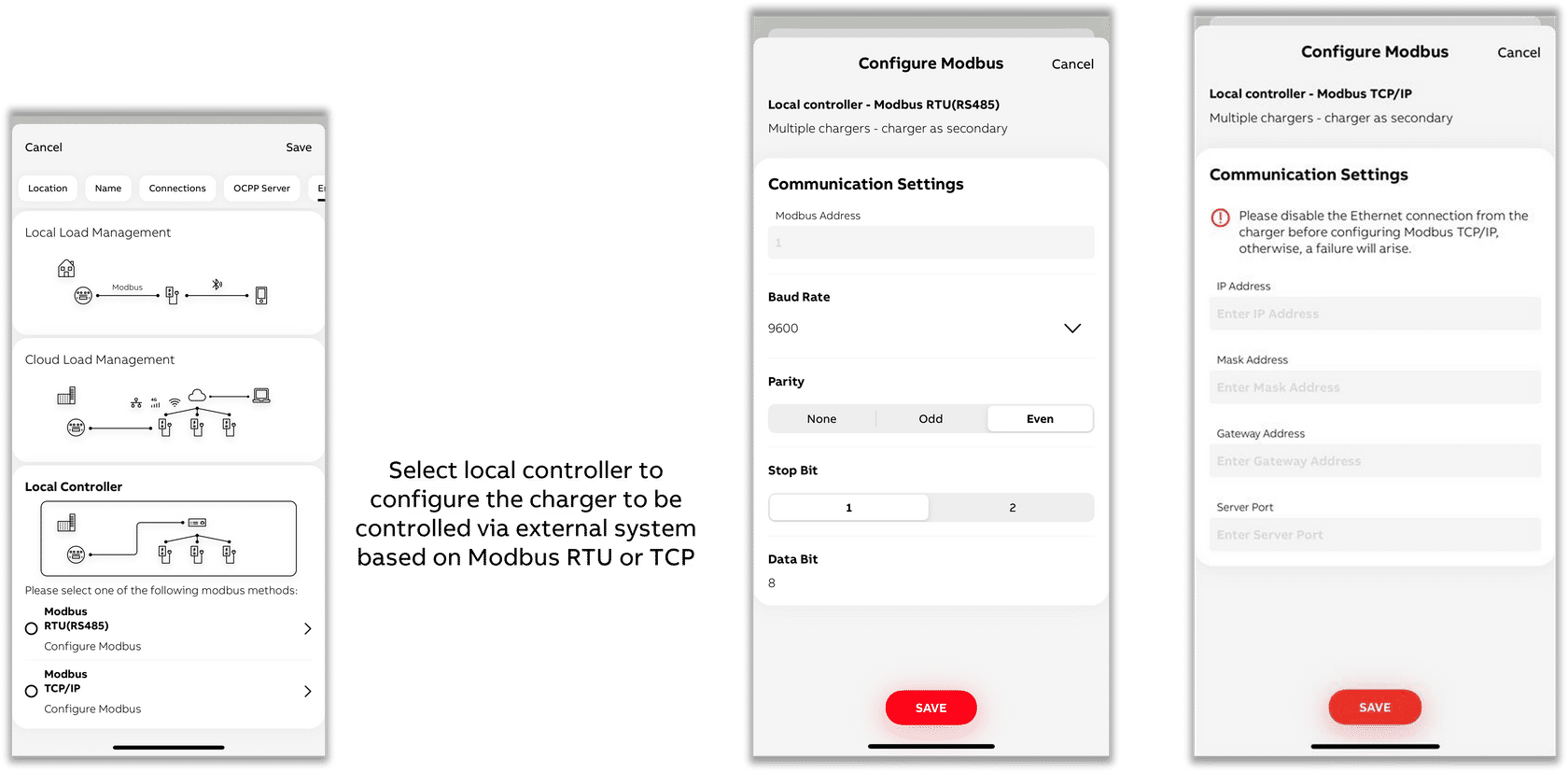 Select "Local controller" and then "Modbus RTU (RS485)" or "Modbus TCP/IP" depending on whether the charging station is connected to the via RS485 or Ethernet.