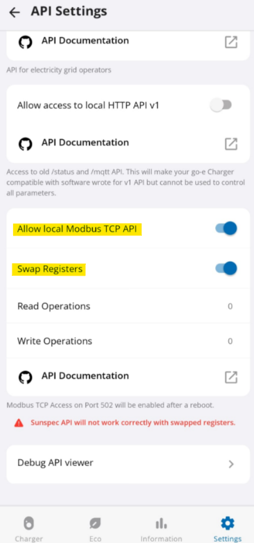 - Be sure that the "Allow local Modbus TCP API" and "Swap Registers" option are enabled.