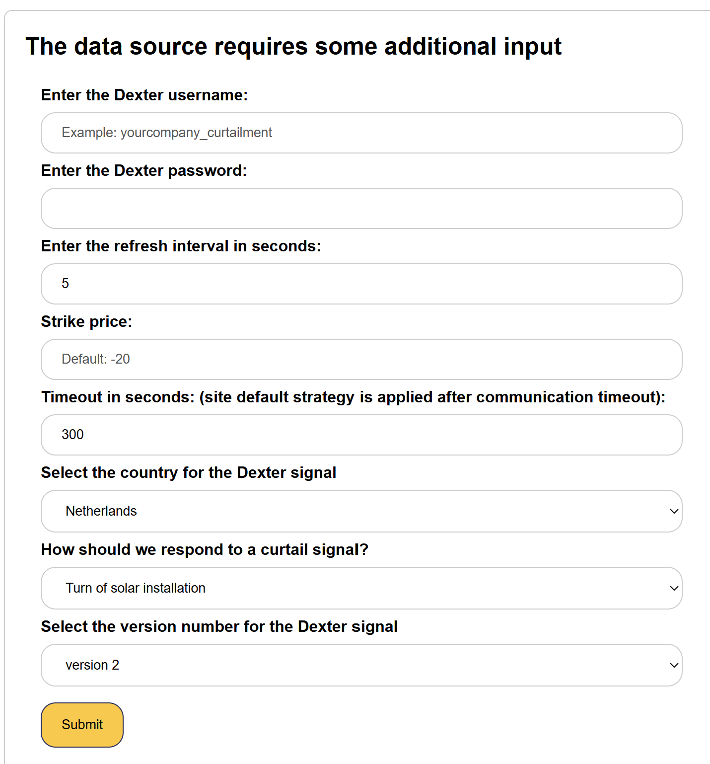 In the SmartgridOne Controller, you can set up the Dexter integration to receive curtailment signals. You can find the Dexter integration in the list of external data sources. The following screen will appear: