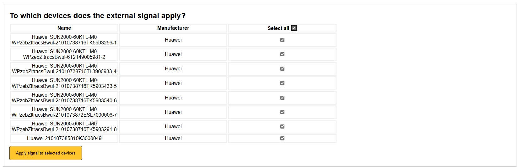Select all inverters that should participate in the Yuso solar curtailment. If you have multiple inverters, you can select them all at once. Important: Make sure that you also include the inverter that you'd like to use for calculating the baseline production. This inverter will not be curtailed, but it will be used to calculate the baseline production. This is important for the Yuso solar curtailment service to work correctly.