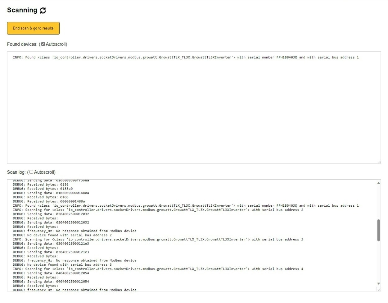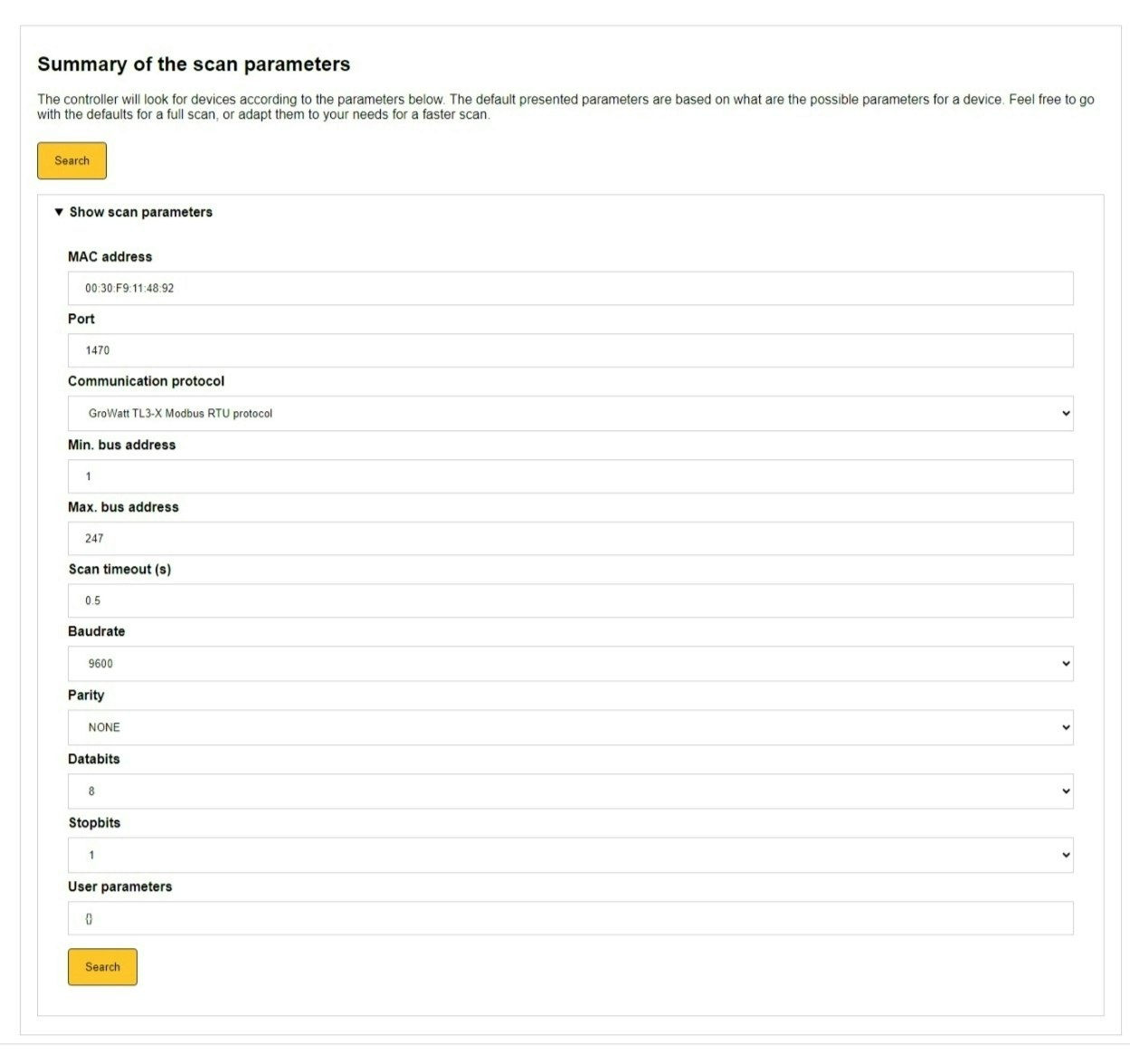 - (This steps and onwards are for both TCP and RS485) In the next step, if required, you can manually adjust the parameters used to search for the device. In most circumstances, we recommend staying with the default set values.