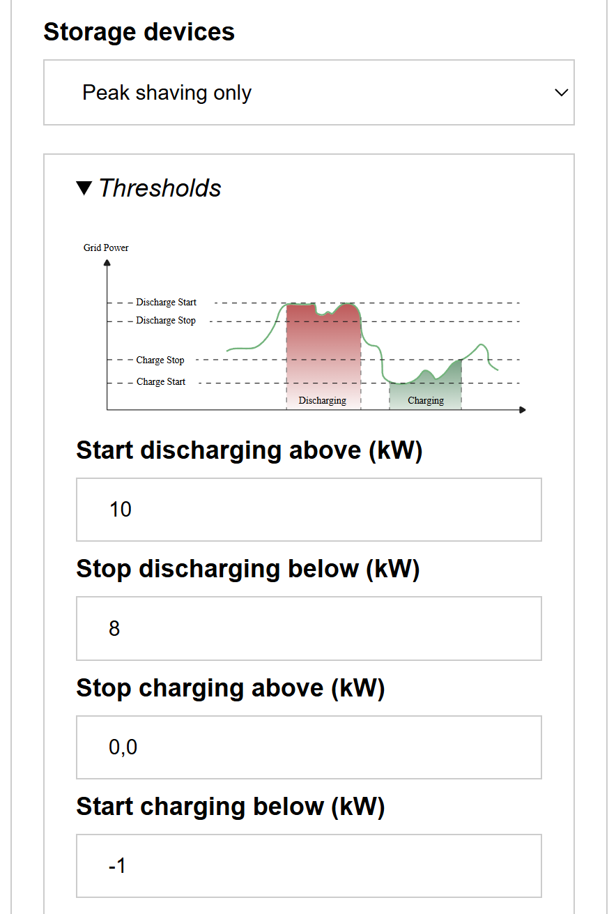 Alternative threshold values can be set from which grid power the battery should charge or discharge.