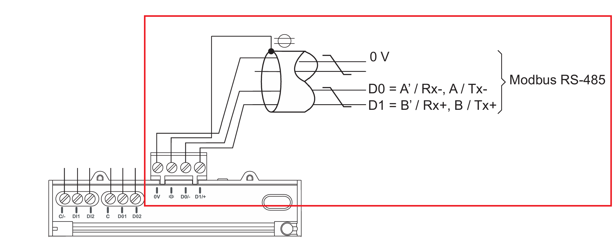 - For correct RS485 wiring: Follow the guidelines for RS485 wiring.