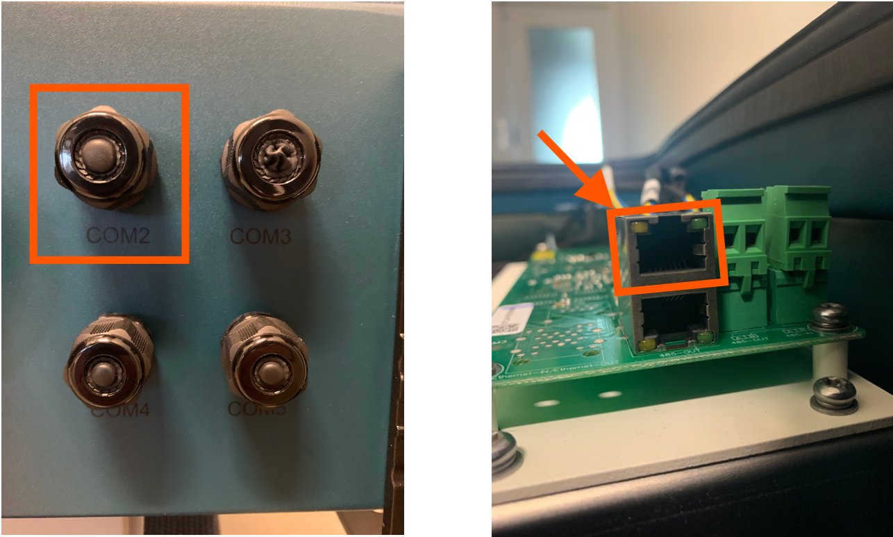 - Removethe cap nut from the waterproof cable glands labeled COM2 and COM3 at the bottom of the inverter. Remove the plug from the fitting.