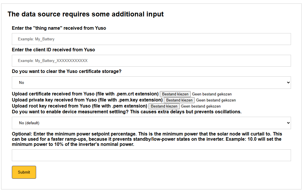 All these things are needed to configure the Yuso external signal in the SmartgridOne Controller. You should have received these files from Yuso. If you haven't received them yet, please contact Yuso support.