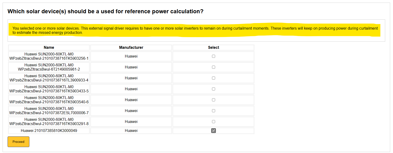 Select all inverters that should participate in the Yuso solar curtailment. If you have multiple inverters, you can select them all at once. Important: Make sure that you also include the inverter that you'd like to use for calculating the baseline production. This inverter will not be curtailed, but it will be used to calculate the baseline production. This is important for the Yuso solar curtailment service to work correctly.